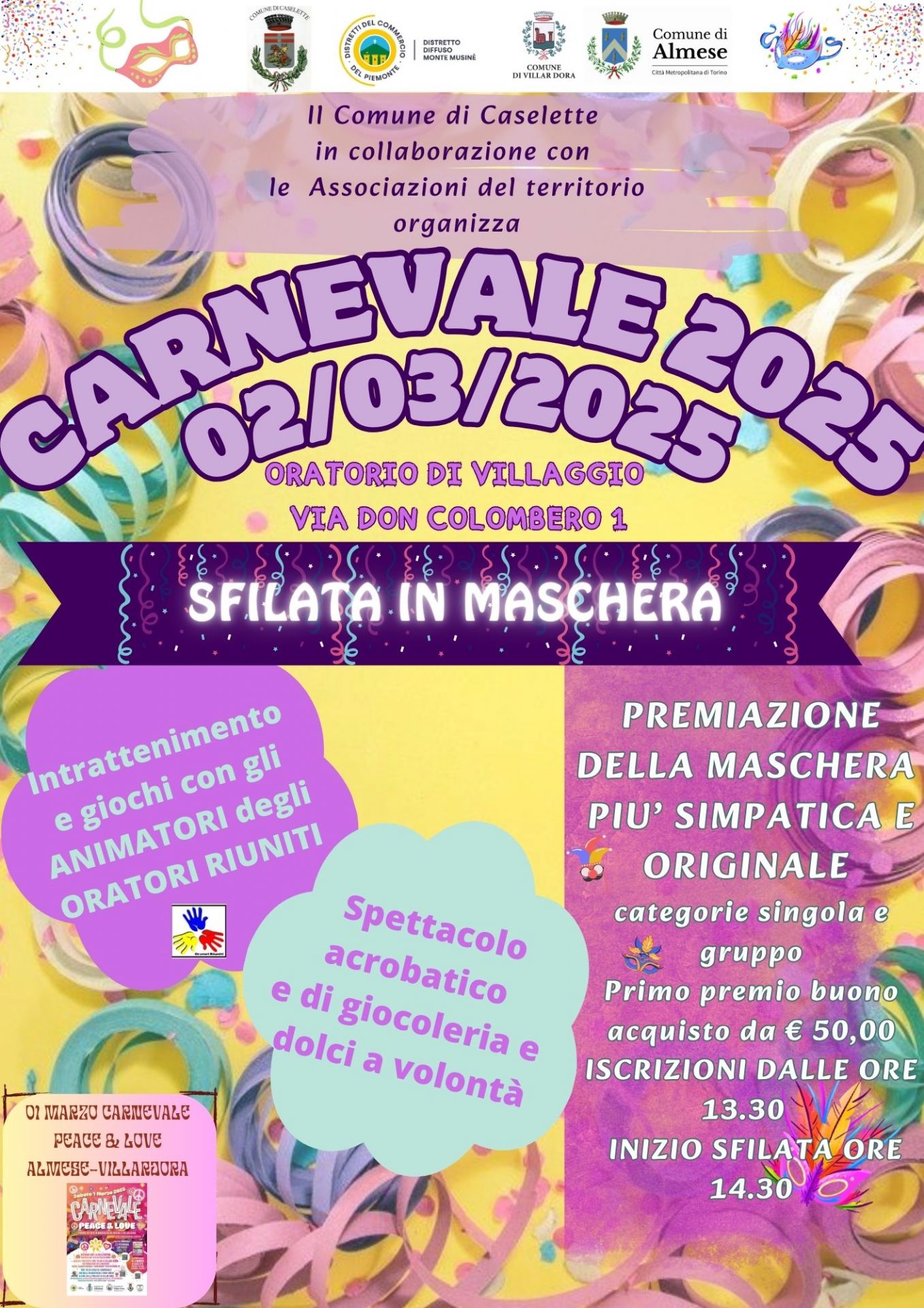 Il Comune di Caselette in collaborazione con le Associazioni del territorio organizza per Domenica 2 Marzo 2025 "Carnevale 2025"
