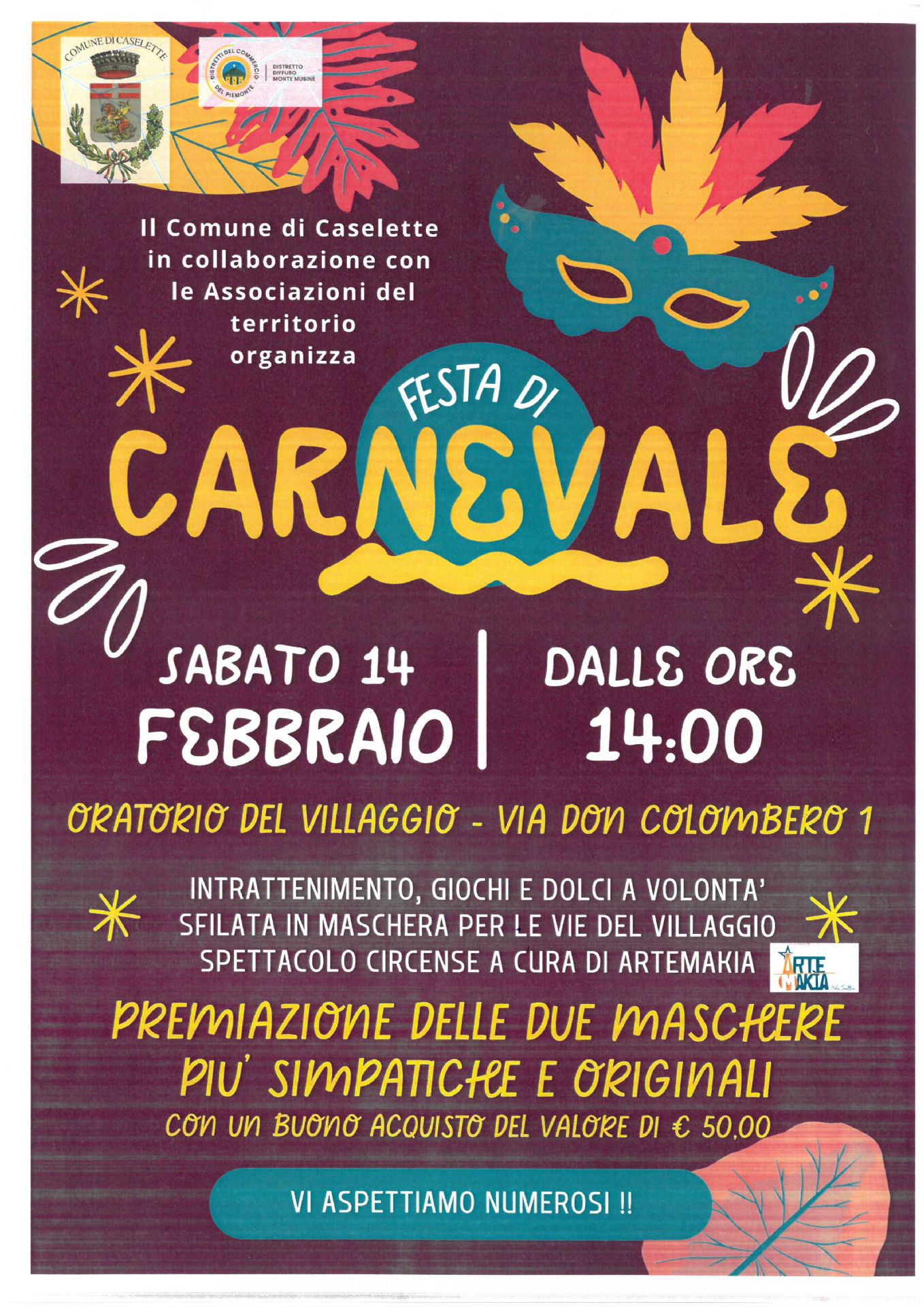 Il Comune di Caselette in collaborazione con le Associazioni del territorio organizza per Sabato 14 Febbraio 2026 dalle ore 14.00 presso l'Oratorio del Villaggio - Via Don Colombero n. 1 la Festa di Carnevale