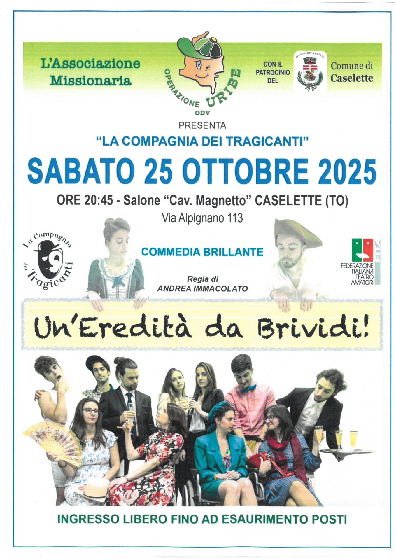 Sabato 25 Ottobre 2025 alle ore 20.45 presso il Salone Polivalente "Cav. del Lavoro Mario Magnetto" si terrà una commedia brillante "Un'eredità da brividi" - regia di Andrea Immacolato