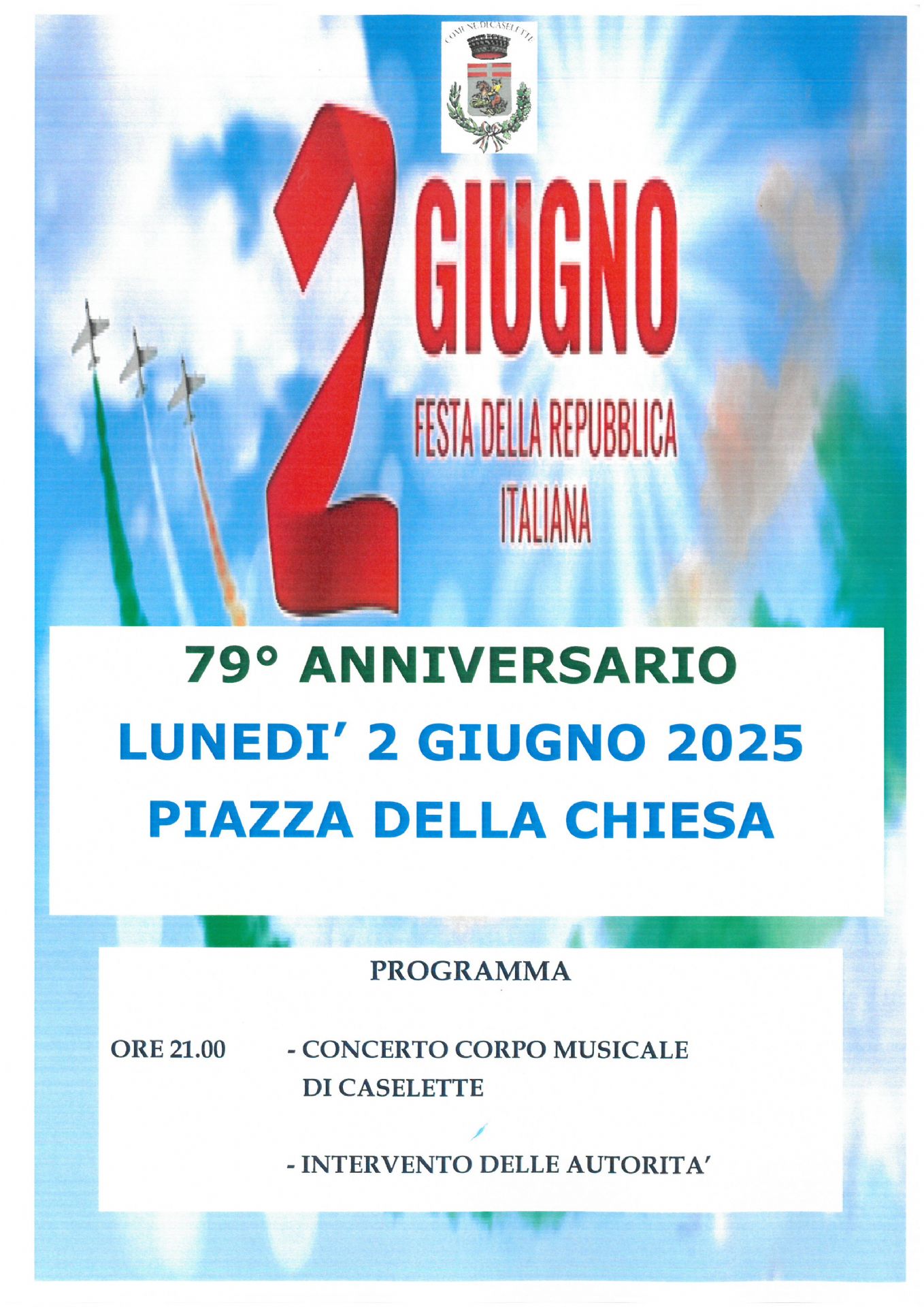 Lunedì 2 Giugno 2025 alle ore 21.00 in Piazza della Chiesa - Concerto da parte del Corpo Musicale di Caselette e intervento delle autorità.