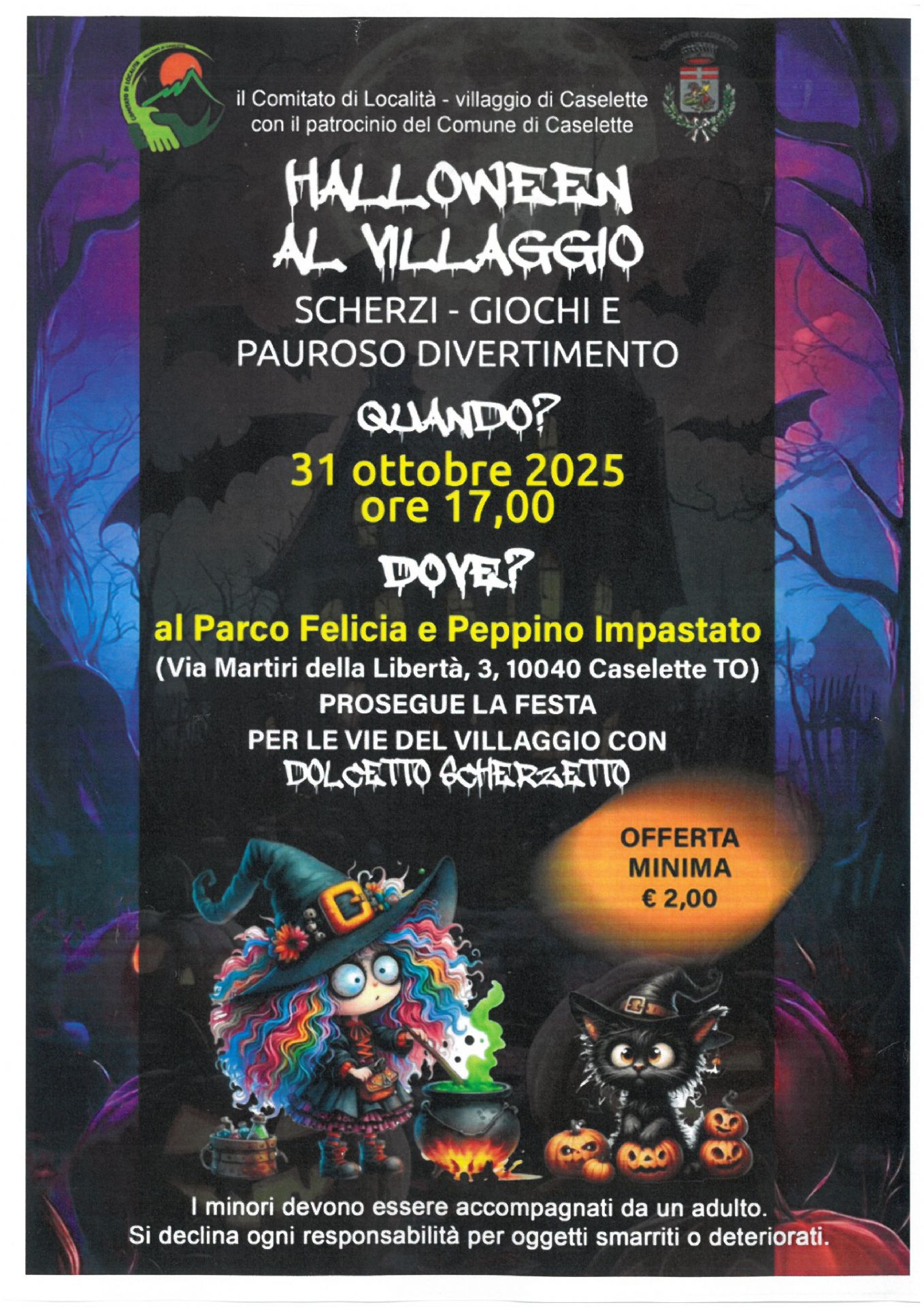 Venerdì 31 Ottobre 2025 alle ore 17.00 presso il Parco Felicia e Peppino Impastato (Via Martiri della Libertà 3) - Caselette "Halloween al Villaggio" scherzi - giochi e pauroso divertimento.