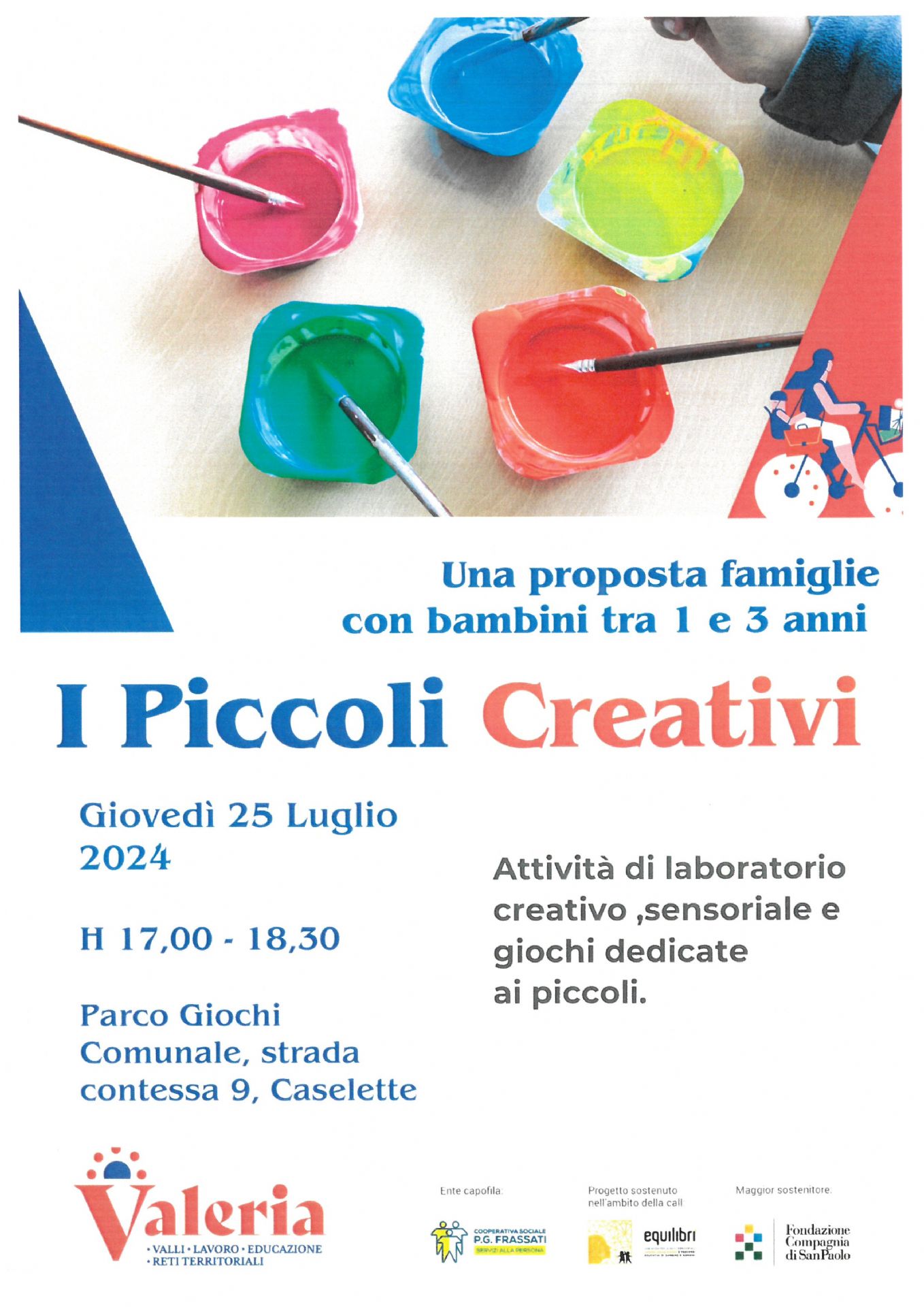 Giovedì 25 Luglio 2024 dalle ore 17.00 alle 18.30 presso il parco giochi comunale - Strada Contessa 9 - Attività di laboratorio creativo, sensoriale e giochi dedicate ai piccoli.