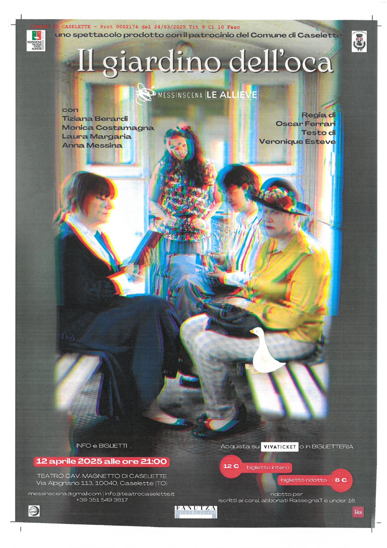 Sabato 12 Aprile 2025 ore 21.00 presso il Salone Polivalente "Cav. del lavoro Mario Magnetto" - Via Alpignano 115, spettacolo teatrale "Il giardino dell'oca" a cura della sezione "allieve"