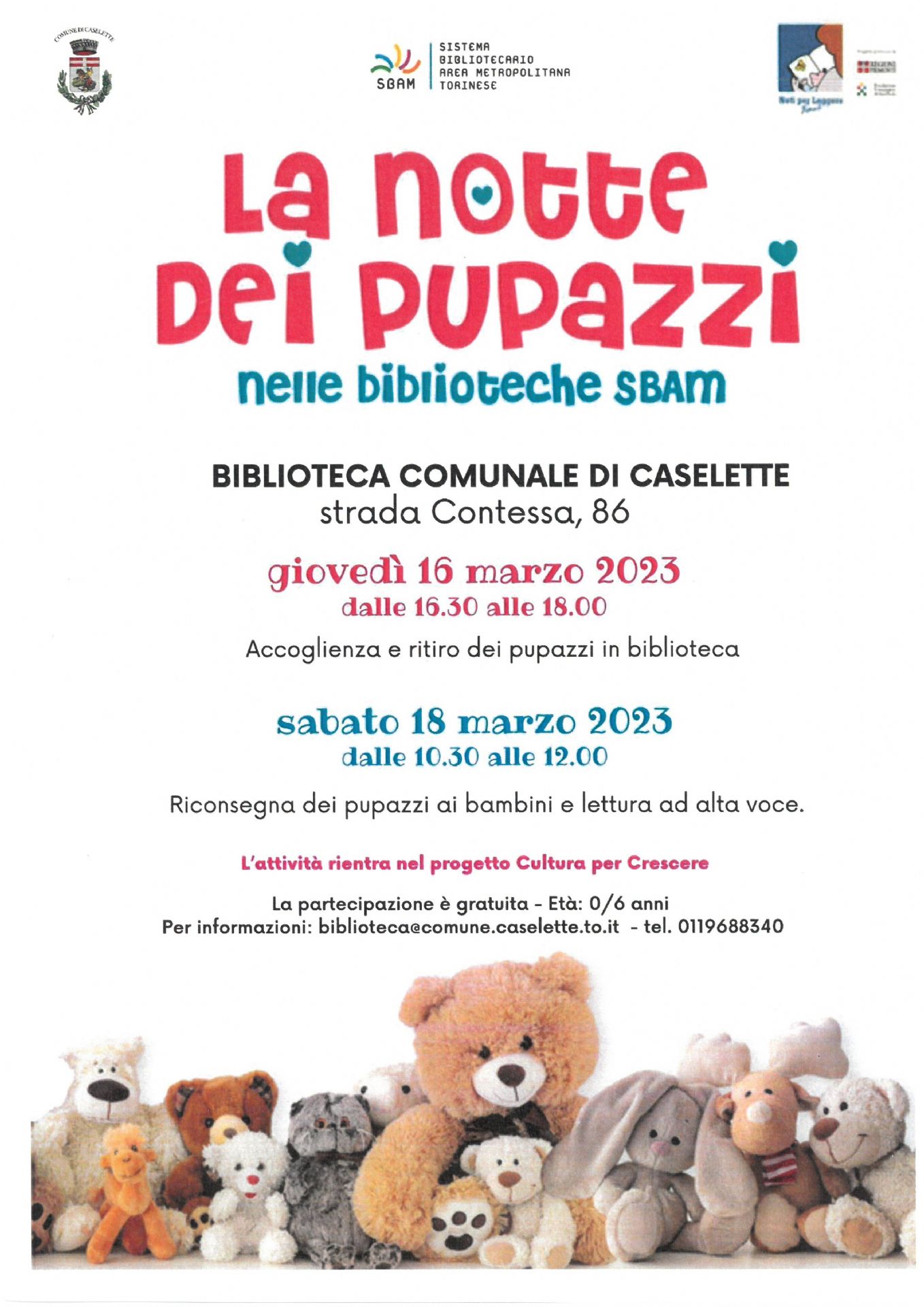 GIOVEDI' 16 MARZO 2023 DALLE ORE 16.30 ALLE 18.00 presso la Biblioteca Comunale "La notte dei pupazzi".