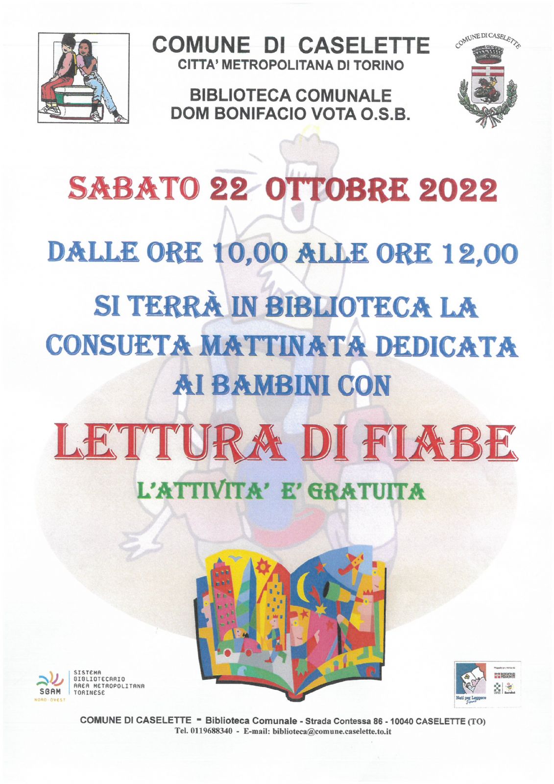SABATO 22 OTTOBRE 2022 dalle ore 10.00 alle ore12.00 si terrà in Biblioteca la consueta mattina dedicata ai bambini con LETTURA DI FIABE
