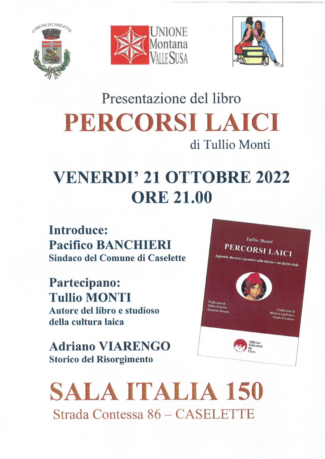 Venerdì 21 Ottobre 2022 ore 21.00 presso la Sala Italia 150, presentazione del libro "Percorsi laici" di Tullio Monti.