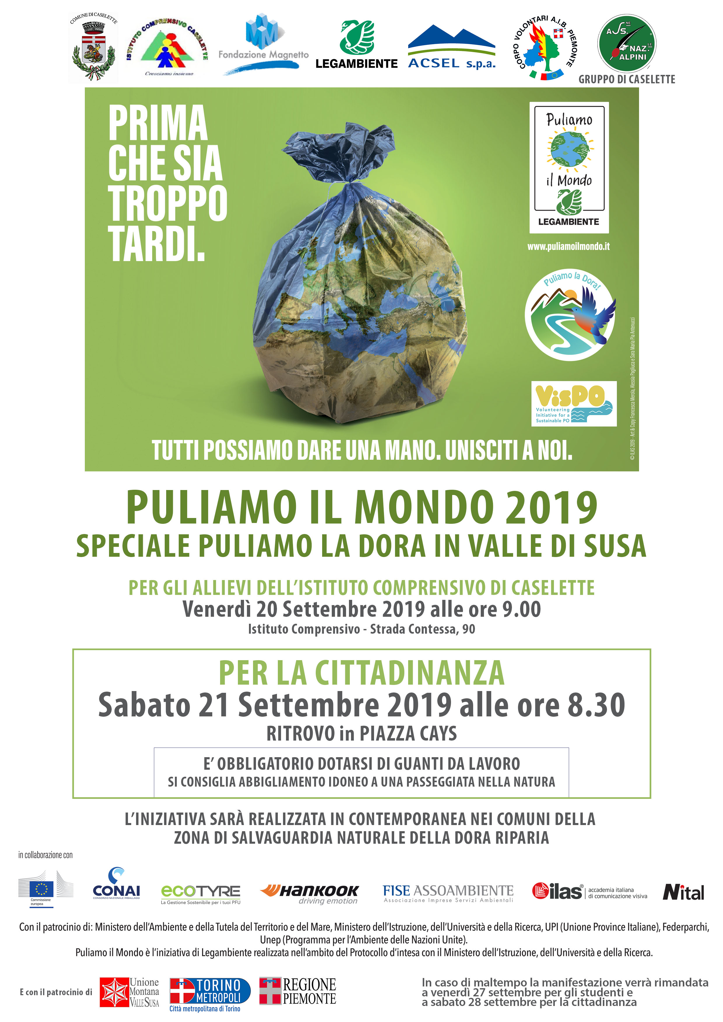 Il Comune di Caselette aderisce, anche quest'anno, all'iniziativa di Legambiente "Puliamo il modo" con uno speciale "Puliamo la Dora in Valle di Susa". Per gli allievi dell'IC Caselette è previsto un appuntamento specifico per venerdì 20 settembre alle ore 9,00, mentre la cittadinanza è invitata a partecipare sabato 21 settembre, con ritrovo alle ore 8,30 in Piazza Cays (obbligatorio dotarsi di guanti da lavoro e di abbigliamento idoneo a passeggiata nella natura).