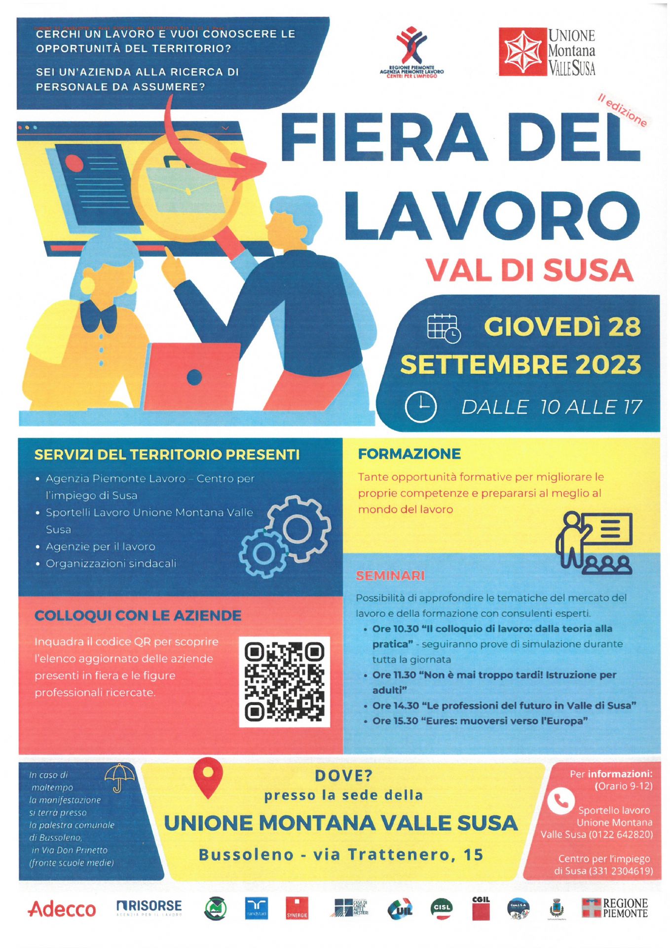 Giovedì 28 Settembre dalle ore 10.00 alle 17.00 "Fiera del lavoro" presso la sede dell'Unione Montana Valle Susa - Bussoleno - Via Trattenero n. 15