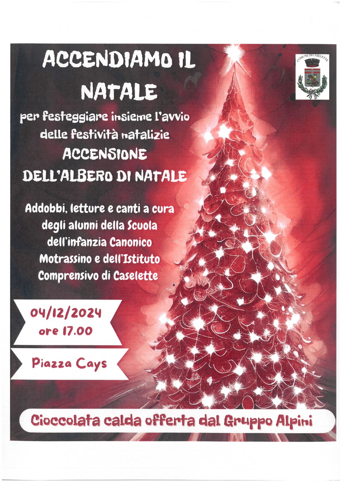 Mercoledì 4 Dicembre 2024 alle ore 17.00 in Piazza Cays ci sarà l'accensione dell'albero di Natale.