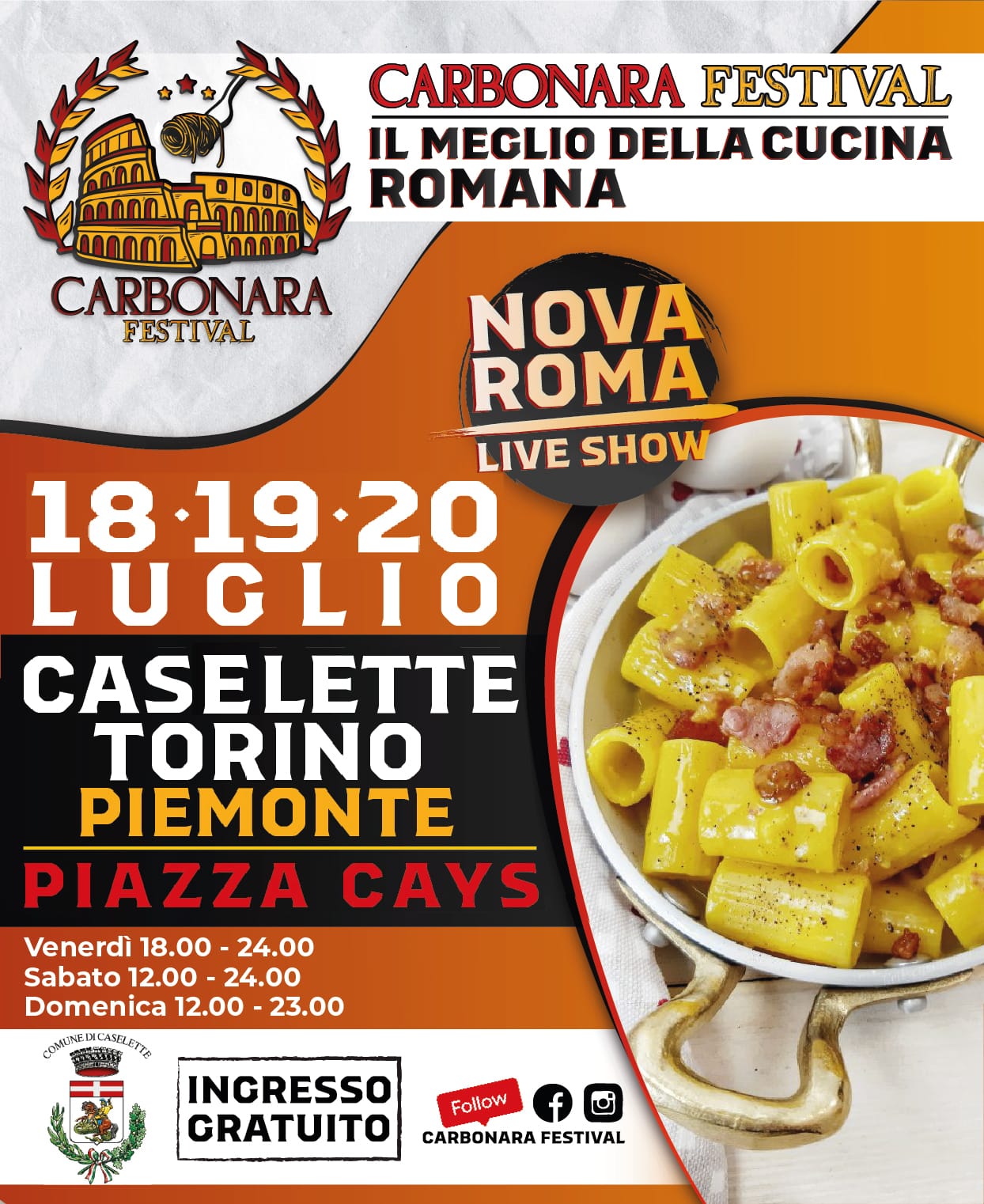 Nei giorni 18-19-20 luglio 2025 si terrà il ''Carbonara Festival'' a Caselette (Piazza Cays)