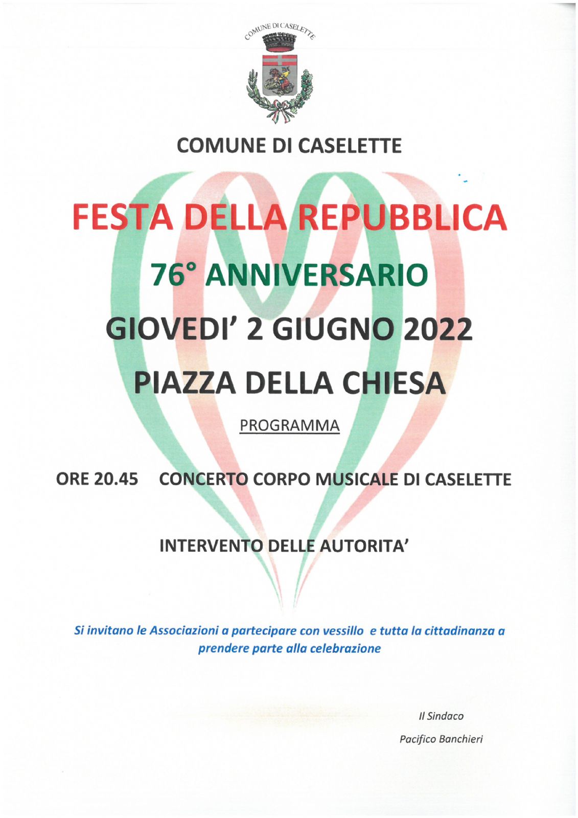 GIOVEDI' 2 GIUGNO 2022 ORE 20.45 Piazza della Chiesa - Festa della Repubblica - 76° anniversario.