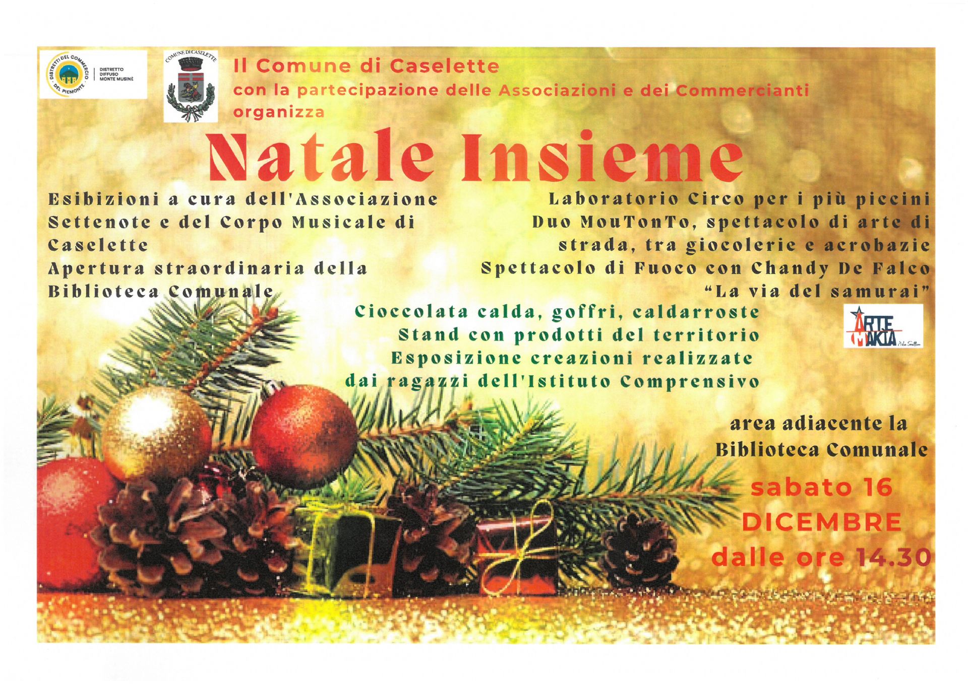 Il Comune di Caselette con la partecipazione delle Associazioni e dei Commercianti organizza per Sabato 16 Dicembre 2023 dalle ore 14.30 nell'area adiacente la Biblioteca Comunale "Natale Insieme"