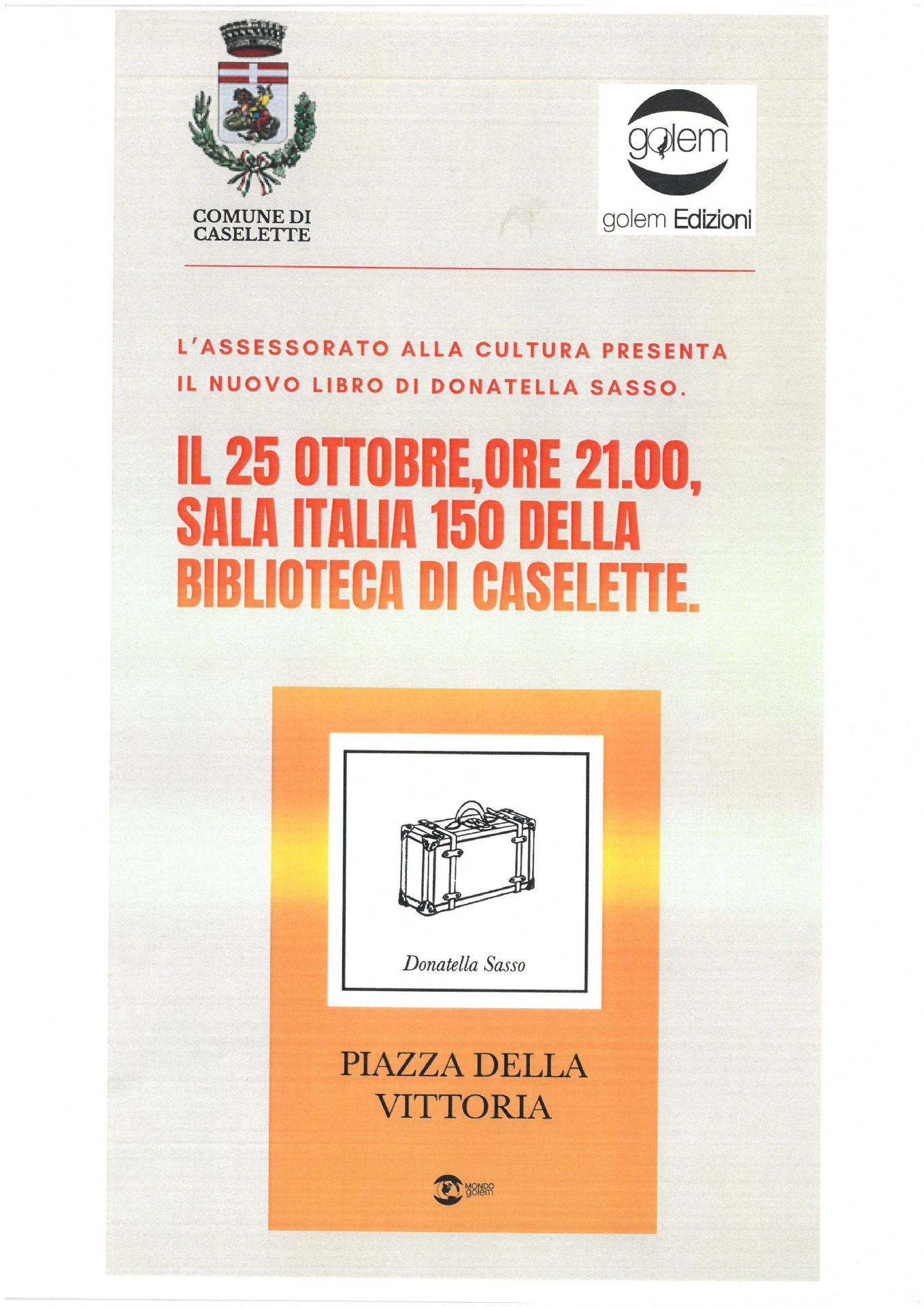 Venerdì 25 Ottobre 2024 alle ore 21.00 presso la Sala Italia 150 - Strada Contessa n. 86, si terrà la presentazione del libro di Donatella Sasso "Piazza della vittoria"