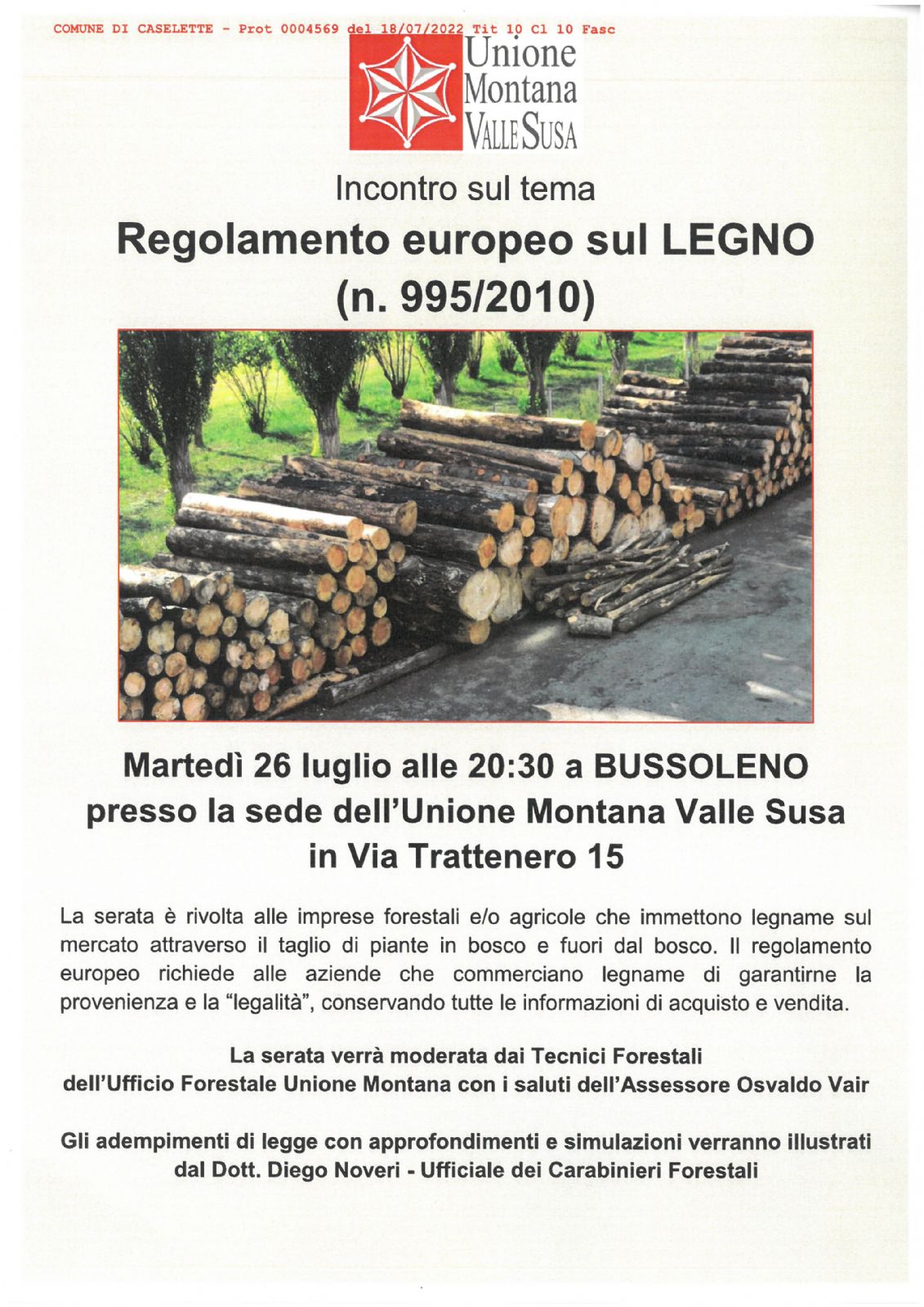Martedì 26 Luglio 2022 alle ore 20.30 presso la sede dell'Unione Montana Valle Susa - Via Trattenero n. 15 - Bussoleno, si terrà un incontro sul tema "Regolamento europeo sul legno"