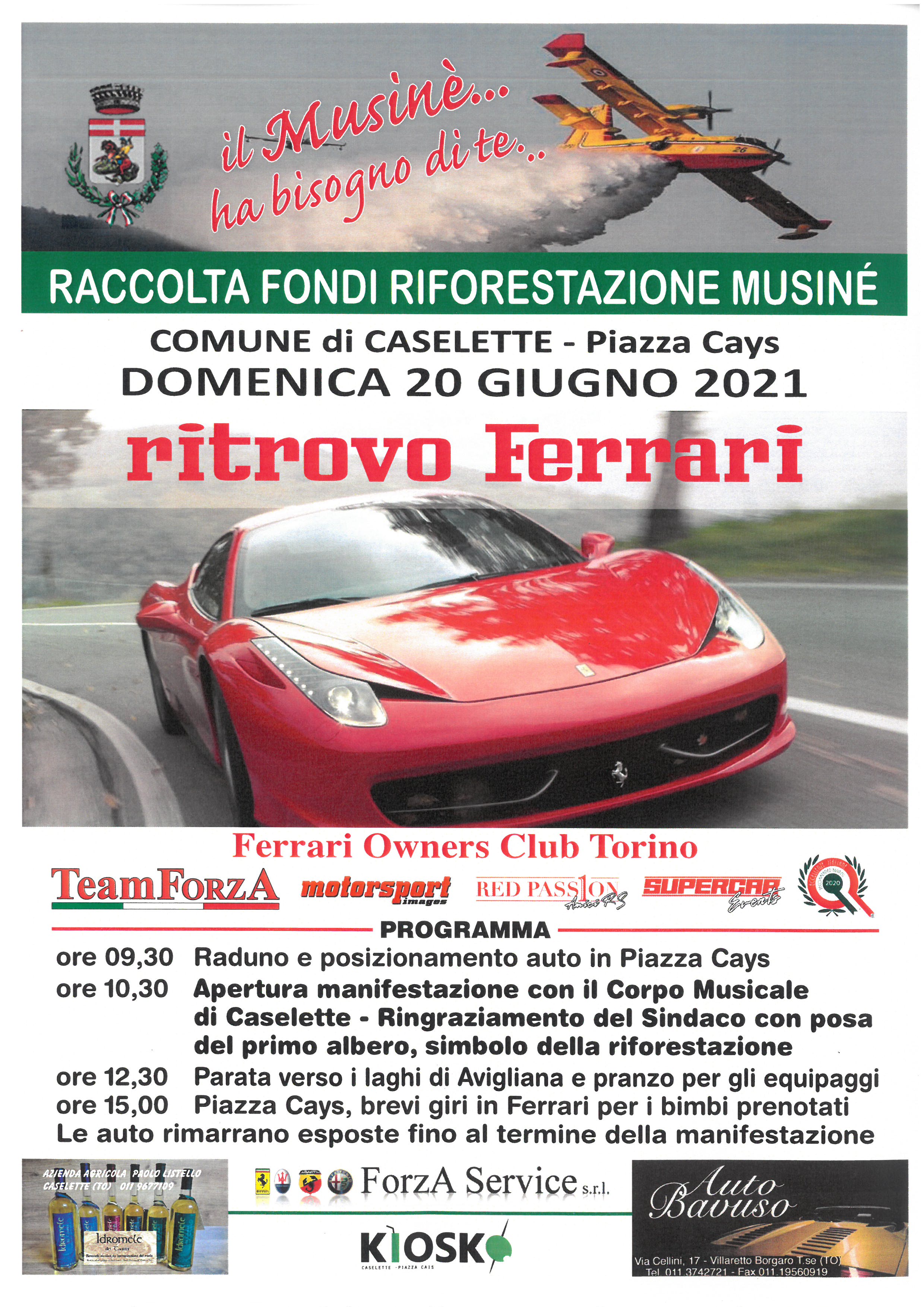 L’Amministrazione del Comune di Caselette organizza per domenica 20 giugno 2021 il Ritrovo Ferrari, obiettivo dell’evento è la raccolta fondi per la riforestazione del Musinè.