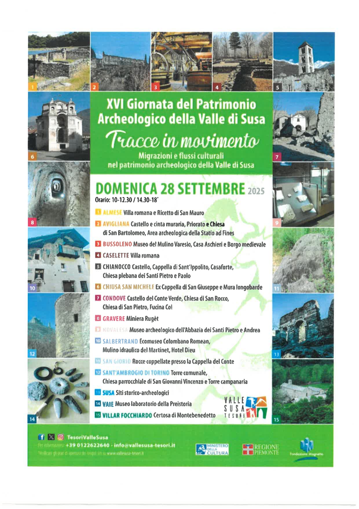 Domenica 28 Settembre 2025 si svolgerà la XVI edizione della giornata del patrimonio archeologico della valle di Susa - ''Tracce in movimento'' Migrazioni e flussi culturali nel patrimonio archologico della Valle Di Susa.