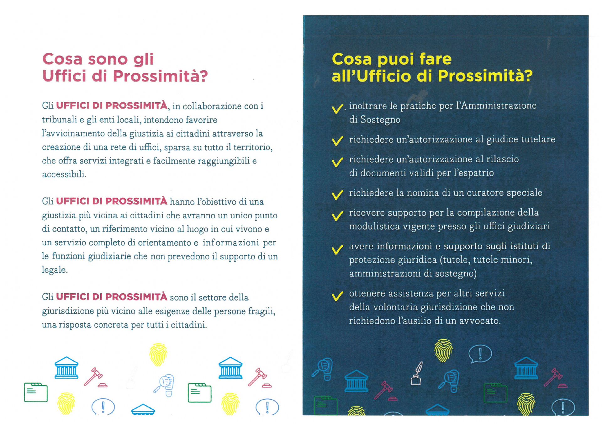 Gli Uffici di Prossimità, in collaborazione con i tribunali e gli enti locali, intendono favorire l'avvicinamento della giustizia ai cittadini attraverso la creazione di una rete di uffici, sparsa su tutto il territorio, che offra servizi integrati e facilmente raggiungibili e accessibili.