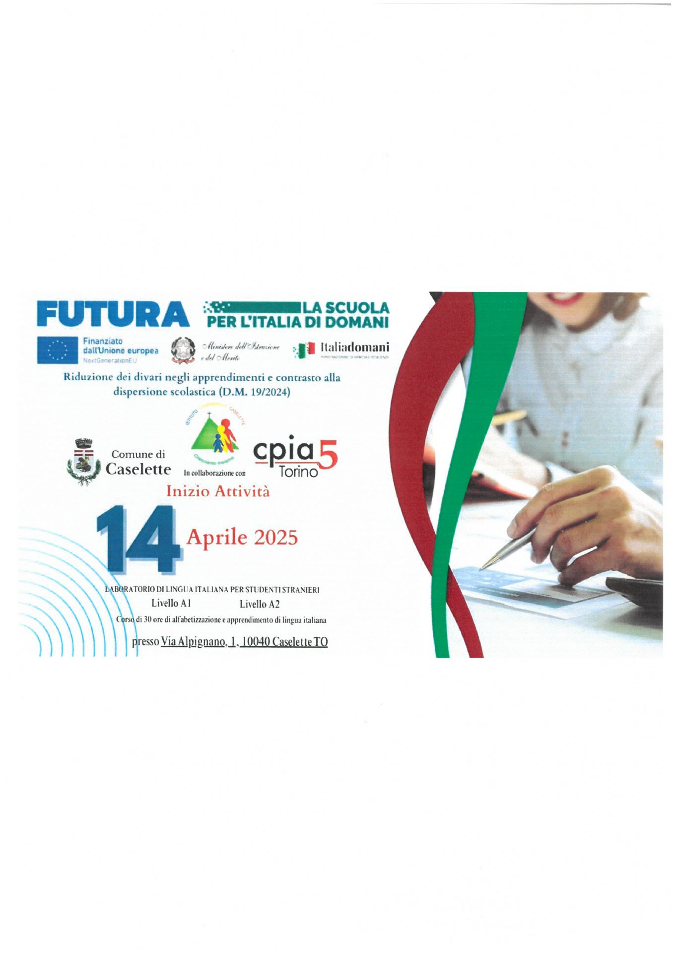 A decorrere dal 14 Aprile 2025 alle ore 14.30 presso i locali comunali siti in Piazza Municipio n. 1, inizierà il laboratorio di lingua italiana per studenti stranieri - Livello A1 - Livello A2 - Corso di 30 ore di alfabetizzazione e apprendimento di lingua italiana (gratuito)