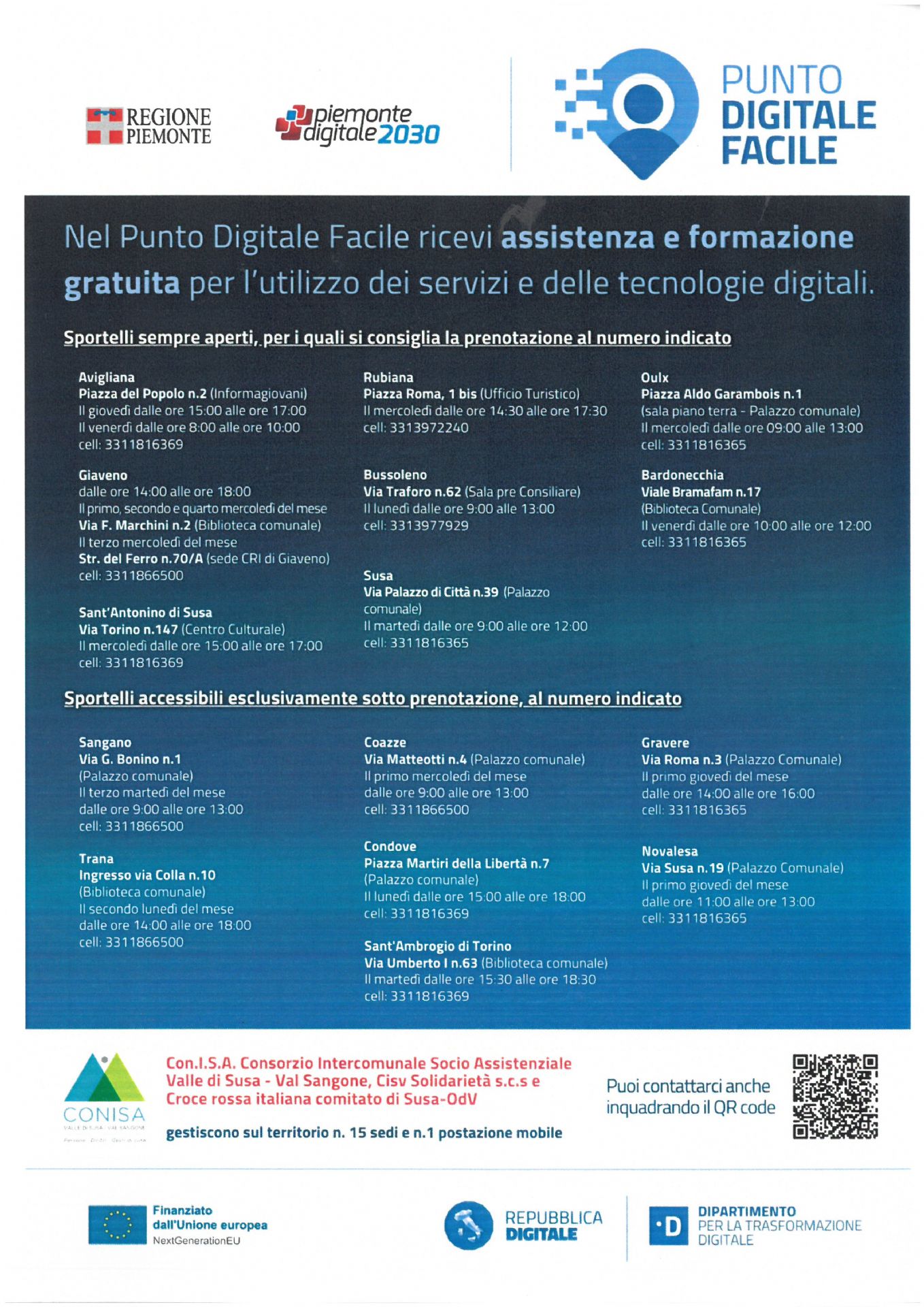 - Sportelli sempre aperti, per i quali si consiglia la prenotazione al numero indicato: Avigliana - Rubiana - Oulx - Giaveno - Bussoleno - Bardonecchia - Sant'Antonino di Susa - Susa